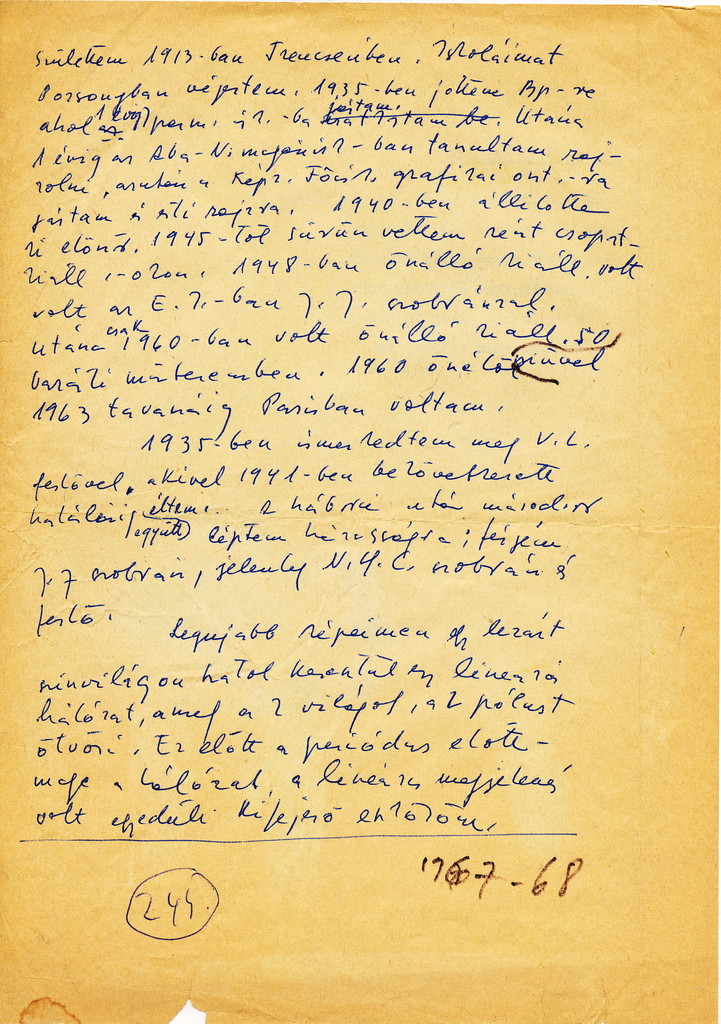 „Születtem 1913-ban Trencsénben. Iskoláimat Pozsonyban végeztem. 1935-ben jöttem Bp.-re ahol 1 évig Iparm. isk.-ba jártam. Utána az Aba-Novák magánisk.-ban tanultam rajzolni, azután a Képz. Főisk. grafikai oszt.-ra jártam és esti rajzra. 1940-ben állítottam ki először. 1945-től sűrűn vettem részt csoportkiáll.-okon. 1948-ban önálló kiáll. volt az E.I.-ban J.J. szobrásszal. Utána csak 1960-ban volt önálló kiáll. baráti műteremben. 1960 őszétől 1963 tavaszáig Párizsban voltam.